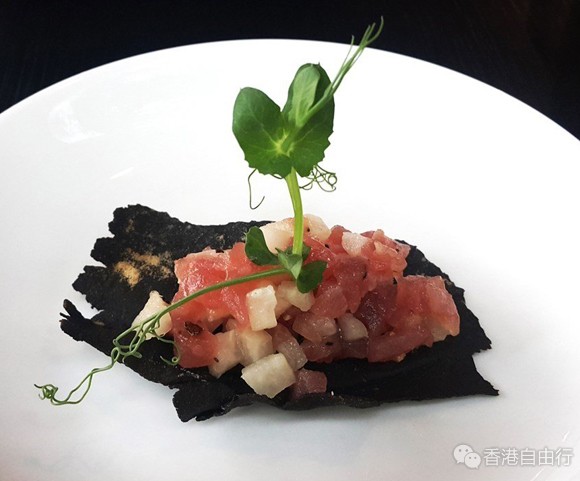 <吞拿鱼>小粒吞拿鱼入口即溶,配上黑色薄脆,变得口感有层次,惊喜度高。