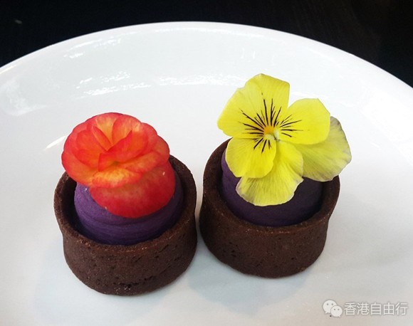 <紫薯朱古力挞> 微甜的紫薯蓉以鲜花作配衬,未食已经赏心悦目。