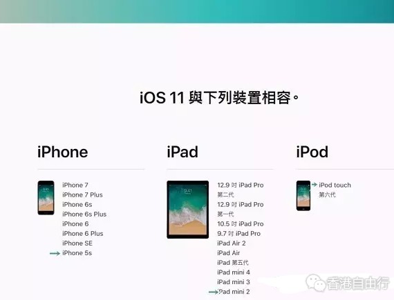 然而并不是所有的机种都支援 iOS 11。符合 iOS 11 升级标淮的装置包括 iPhone 5s、iPhone SE、iPhone 6 / 6 Plus、iPhone 6s/6s Plus、iPhone 7 / 7 Plus。在 iPad 机种部分,则有 iPad Air、iPad Air 2、iPad Mini 2、iPad Mini 3、iPad Mini 4 、第五代 iPad 与 iPad Pro 全机种;以及第六代的 iPod Touch。