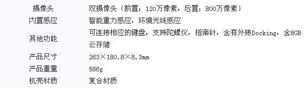 另外,这款平板电脑采用了支持多点触控10.1英寸的IPS广视角屏幕,配备有1GB内存和32GB的存储容量,支持SD卡扩容。拥有蓝牙和WiFi两种无线连接方式以及标准USB 2.0接口。机身前后有120万和800万像素两个双摄像头,预装Android 3.2操作系统。