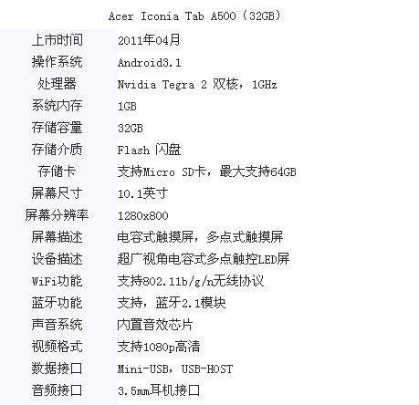 配置方面,A500采用Android3.1的操作系统,NVIDIA Tegra 2 高达1GHz的双核处理器,屏幕分辨率是1280x800 并且配备双摄像头给爱自拍的你提供了臭美的机会。