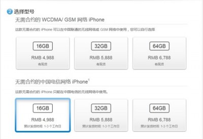 与此同时,苹果官方网站也正式开售电信版iPhone 4S,在官网上发售的中国电信版 iPhone 4S 与 WCDMA/GSM 版本的 iPhone 4S 并没有太大分别,16GB丶32GB 及 64GB 售价依然是 4988丶5888 及 6788元,不过苹果强调,中国电信版的iPhone 4S只支持中国电信的网络,而联通版的iPhone 4S可以支持WCDMA和GSM网络。