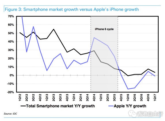 Business Insider称,但是,除iPhone 6周期外,苹果手机销售的增长总是低于市场整体水平。