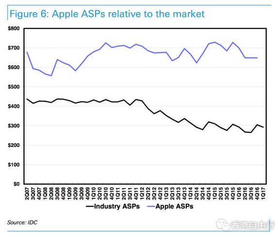 苹果把iPhone平均售价保持在600 – 700美元(约合人民币4066 - 4744元)。目前手机平均售价不足300美元(约合人民币2033元),而且在不断下跌。有传言称新款iPhone售价可能超过1000美元(约合人民币6777元)。