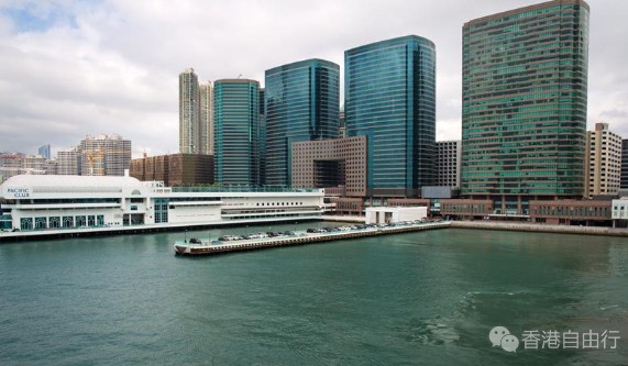 靠近海边的一侧是光亮的不锈钢横拦,对岸是会展中心、金紫荆广场、沿岸高低错落的楼群及港湾中停泊的巨轮。