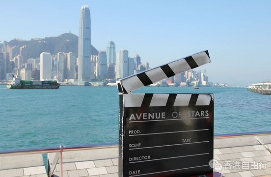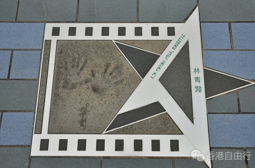 在星光大道的深色条带路面上,每隔几米就可以看到一块特制的方形牌匾,一颗大大的五角星覆盖在一截电影胶片上,上面印有林青霞、成龙、李连杰等香港杰出电影明星的手模和签名。