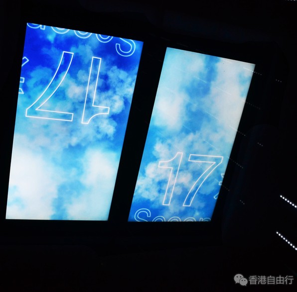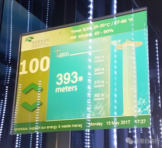 没想到这里的电梯也是超帅的,整个装饰有种时空穿梭的感觉,顶头的电子屏会一直顺数秒数,60秒就能上升到393米,后来看介绍才知道,这是全港最快的高速电梯。