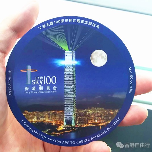 到达上面可以找旅客中心免费拿一个杯垫,拿到了一个夜版的,另外还有日版的。用天际100的APP扫一下可以看见立体的天际100出现,样子跟杯碟的照片差不多,会发光,还是挺帅的。