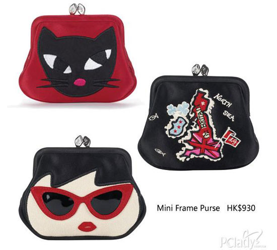 俗语有云「观人于微」,观察一个人要从细微之处着眼,而Lulu Guinness亦贯彻始终,小至零钱包亦十分趣致,让女生充分展现她们的可爱个性。名为「The World Is Your Oyster」的零钱包在黑色锻面上绣有粉红色系的卡通版英国版图,寓意一切尽在你掌握之中,别具意思;另一款设计以小黑猫刺绣图案为主,背面却幽默地刺绣了一只正逃跑的小老鼠,悄悄上演一幕猫捉老鼠的情节;第叁款的设计则是迷你版的Dolly Face,浑圆的帆布脸蛋上架上醒目的红色漆皮墨镜,配上歪到一边的漆皮小红嘴,跩跩的甚有性格。三款设计小巧精致,势必令人爱不惜手。