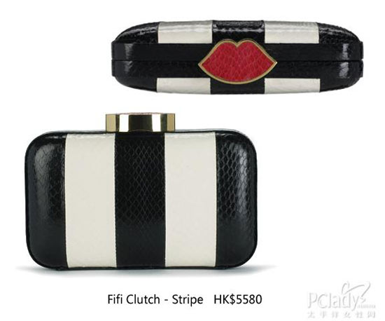 品牌另一备受欢迎的Clutch Bag系列,圆滑的长方形盒身上加上佻皮的红唇金属啪扣,设计高贵大方却又渗出一丝玩味。今季最新推出的黑白间条配搭,以经典复古的粗间配合高贵的蛇皮,摩登时尚,流露典型的英式优雅,难怪Lulu Guinness会被誉为英国手提包女王!