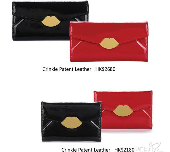 信封形的漆皮叁摺式银包缀以品牌签名式的嘴唇金扣,恍如将唇印印于情信之上,设计简洁之余又不失玩味。系列备有两种尺寸,而长银包内除多个卡片位外,亦设有收纳小物的拉链位置,设计贴心。