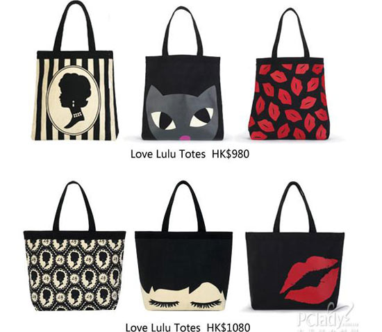 品牌设有一系列tote bag,分别用上性感热情的signature红唇、逗趣的灰色小猫、可爱的娃娃脸Dolly Face,以及设计师Lulu的剪影作主题,各有特色。Love Lulu Totes备有以Lily及Luisa命名的两款袋形,配合不同的需要。