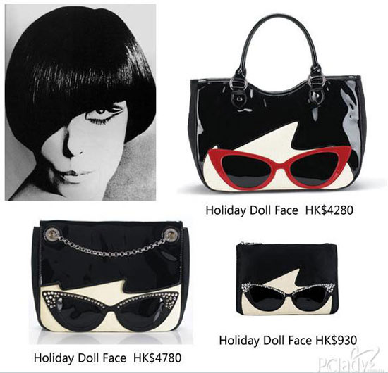 设计师以60年代名模Peggy Moffitt为灵感,用漆皮勾勒出名模摄人的眼眸及乌黑的秀发,创作出备受注目的Kiss & Makeup手袋系列。是季这张可爱的娃娃脸收起迷人的眼神,架上一副复古的猫眼墨镜,造就了全新的Holiday Doll Face系列,增添几分高傲佻皮。部分款式更缀以银色窝钉及珠片,再配合银链手挽,正合近期大热的Bling Bling元素。