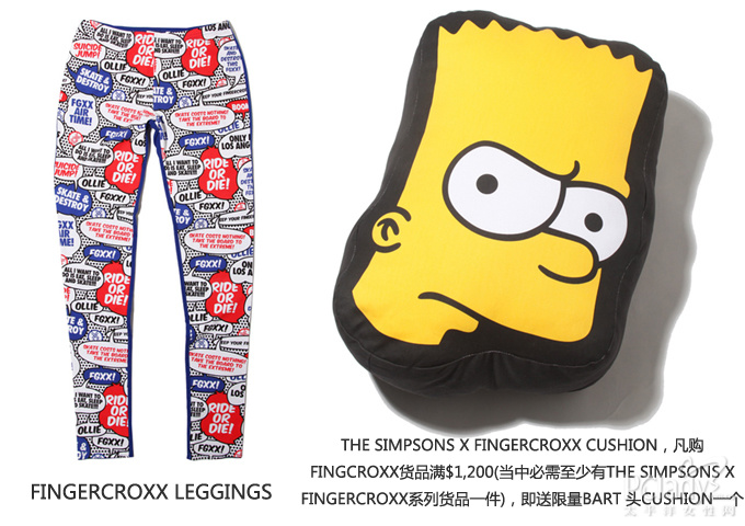 除此之外,fingercroxx 亦以美式漫画的对话方块为题材,在自家系列中推出一款玩味leggings,实属联名系列的最佳配衬品。而作为《The Simpsons》的忠实 fans,除了有藉口入手之外,现凡于fingercroxx 购物满$1,200(当中必需至少有 The Simpsons x fingercroxx 系列货品一件),即送大过人头好多的Bart头 cushion一个,当然数量有限,送完即止啦!