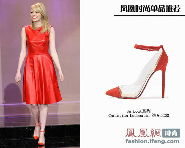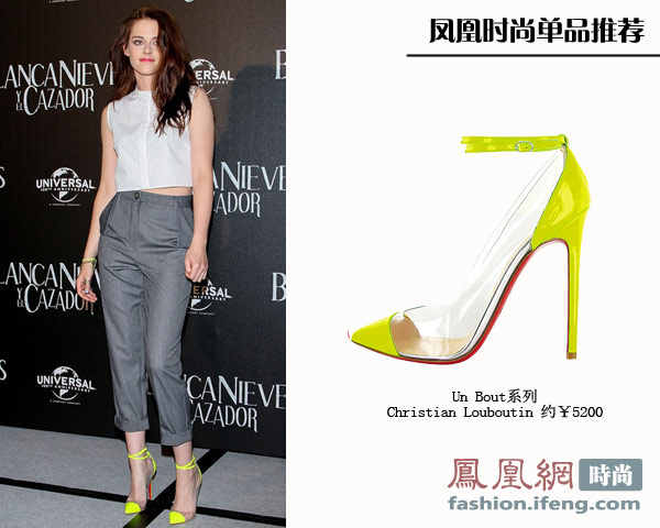 吸血女一身素雅的装扮倒很适合办公室穿着,荧光黄的这款鞋子来自Christian Louboutin的“Un Bout”系列,鞋面两边是透明的,鞋头和鞋带分别为亮眼色彩,远看只有这两部分点缀一样,显得整体也很轻盈。