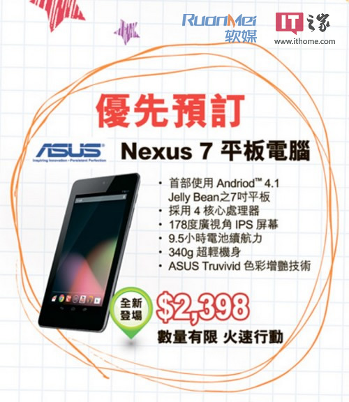 谷歌Nexus 7平板电脑近日在香港开始接受预订,16GB版售价2398港币(约合人民币1966元),美国的249美元(约合1580元人民币)售价略贵一些;暂时没有8GB版Nexus 7的消息,或许不会在香港推出。