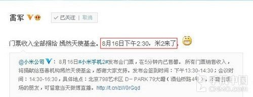 小米手机从诞生到现在已经有了一年时间,已经变得越来越成熟。虽然受到了褒贬不一的舆论,但是其还是成为了最受手机玩家和手机发烧友最关注的产品。而1999元的定价也使这款硬件配置不俗的产品更加亲民。前不久,雷军通过微博发布了小米2手机将于8月16日在北京的798正式发布的消息。