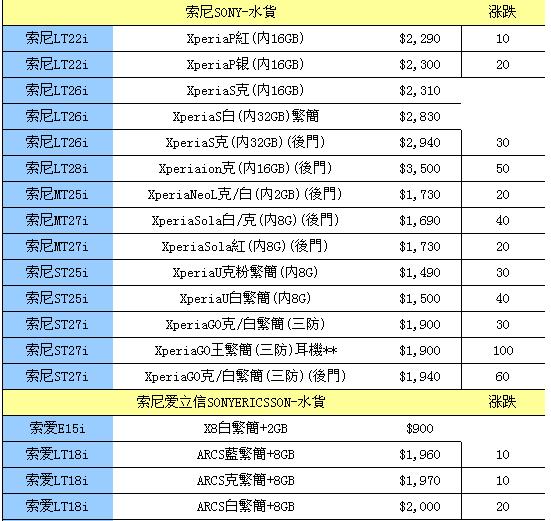 索尼手机在长期以来都保持下降的势头,尽管索尼的手机基本上都属于新机型,可是也几乎从不止降,仅少数机型偶尔小幅度反弹,例如前期猛降的LT22i,暂时稳定于2300港元左右,不时有微幅上涨。另一款有涨价的机型便是旗舰机LT28i,售价最高却仍不断涨价,说明人气旺盛。再关注价格下调的机型,本周的猛降属于ST27i,这款拥有三防功能的手机在出现的时候定价稍高,所以目前价格不断下潜,对三防功能感兴趣的朋友可以保持关注。