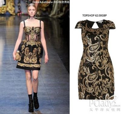 Dolce&Gabbana2012年秋冬秀场上满场华美的装饰图案和性感的蕾丝上演了一次西西里式巴洛克的传统风格,糅合蕾丝滚边采用了金属丝线完成的金色刺绣使Dolce&Gabbana高级成衣充满时尚的复古韵味。