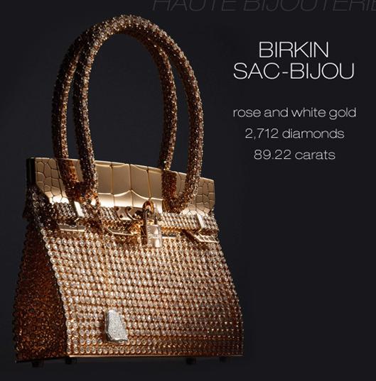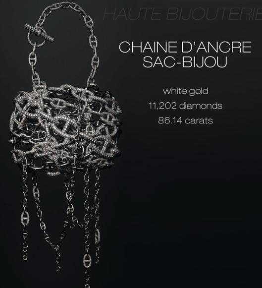 Haute Bijouterie系列把爱马仕柏金包 (HermesBirkin) 和爱马仕凯莉包 (Hermes Kelly) 的外形进行了再设计,保留了传统的手工工艺,而材质则由更昂贵的黄金和钻石代替。其中的Chaine d'Ancre包包由白金打造,缀满了1,303颗钻石,而备受大家喜爱柏金包 (Birkin) 则延伸出白金和玫瑰金两种创意款式,各镶嵌2712颗钻石。这样的材质和设计,对你来说是不是奢华的终极诱惑呢?