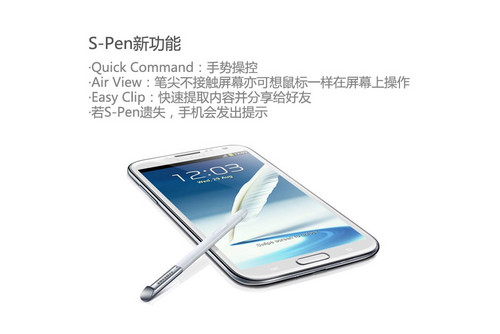 这次S Pen加入了众多新功能,包括Quick Command、Air View和Easy Clip。第一样功能是手势触控,第二样功能可以让笔尖在不触碰屏幕的情况下,像鼠标般在屏幕上操作文件夹和图片库,最后一样功能可以快速提取内容并分享到网络。这些功能对于使用者操控日历和发送邮件更为子方便。对于一些比较粗心大意的用户来说,S Pen如若被遗忘没有被放回在手机里面,其会有提示出现提醒用户。