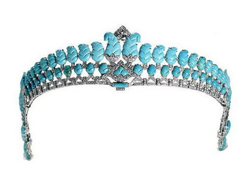 1936年制,卡地亚波西风格冠冕,铂金镶嵌棕树叶形状的绿松石和梨形钻石,端庄奢华。
