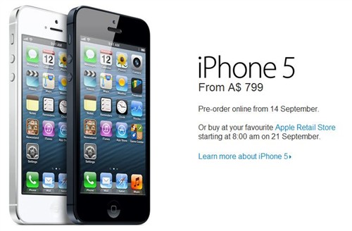澳大利亚“无合约”的iPhone 5售价为799澳元起,其开启预售的时间是9月14日,正式开卖的时间是9月21日早8点。