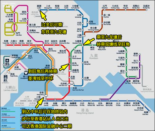 首先从罗湖火车站走罗湖关前往香港,过完关后可以直接乘坐开往——红磡的香港东铁,乘坐到“九龙塘站”然后转乘地铁“观塘线”至“旺角站”再转“荃湾线”至“中环站”,出站后便可以步行到“香港IFC国际金融中心了(香港站)”。