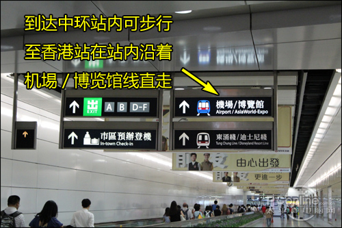 沿途有很明示的指示牌,从中环站步行至香港站 往机场/博览馆线方向走