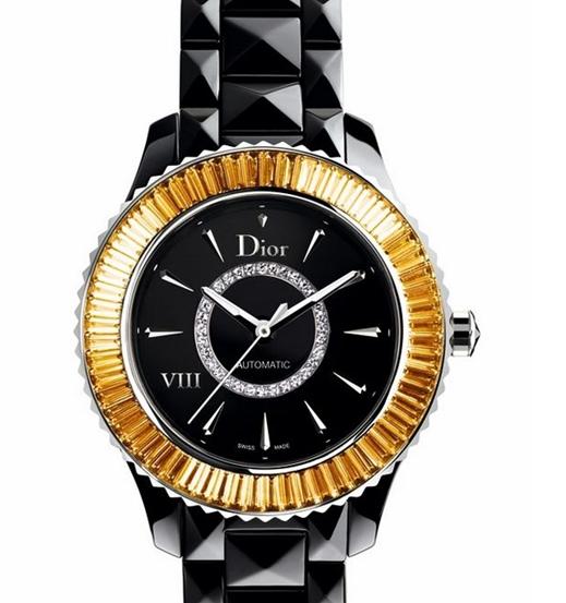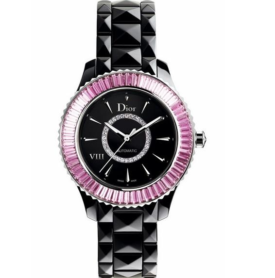 而与DIOR VIII GRAND BAL手表款式系出同门的DIOR VIII BAGUETTE直径33毫米钻石镶嵌手表,抑或是采用了全新镶嵌手法的多款DIOR VIII自动上弦手表,在展示DIOR迪奥手表品牌家族中这一不可或缺系列的精神价值的同时,也逐步将这个系列日臻充实、完美。每一颗钻石或珠宝精致巧妙的镶嵌,仿佛都是在以不同的方式,述说着女人的别样心思。但无论手表样式的变迁如何纷繁复杂,位于任何一款DIOR VIII系列手表8 点钟刻度位置上的罗马数字“VIII”以及那无人能够参仿的金字塔形切割,都似乎在我们发出提醒——你所拥有的这款手表,属于一个最能彰显女性魅力的品牌,属于一个最能体现高贵女性与时空之间联系的手表系列。