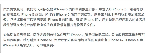 作为首批上市国家和地区之一,香港今天终于开始接受 iPhone 5 的在线预订。但为了更进一步的杜绝大陆黄牛倒卖,这一次连在线预订的时候都必须要香港身份证号或者由港府颁发的港澳通行证号才可以提交订单,并且领取 iPhone 5 的时候也需要持有效身份证件直接到苹果香港IFC零售店领取(如果确认预订成功的话)。