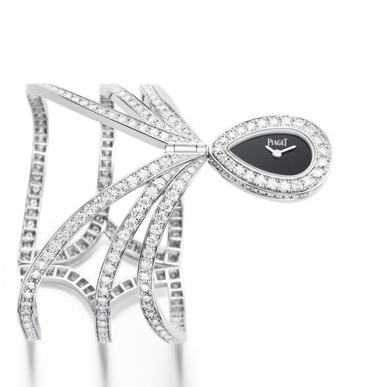 高级珠宝手镯表,白金材质,镶饰297颗圆形美钻(总重约10克拉),黑色表盘,搭载伯爵56P石英机芯