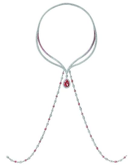 白金材质项链,镶饰圆形美钻、圆形切割红碧玺、梨形切割钻石、梨形切割红碧玺、圆形切割粉色蓝宝石及1颗中央梨形红碧玺主石(总重约11克拉)
