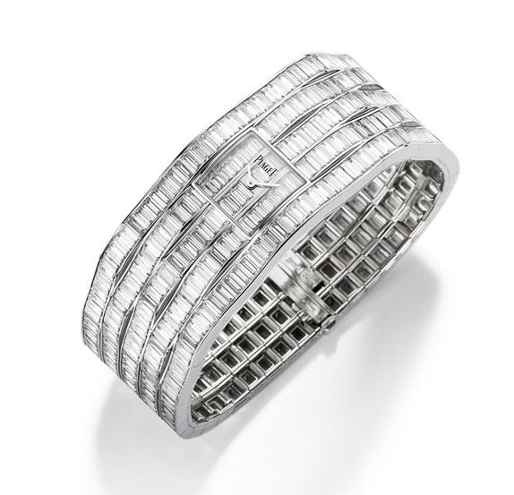 高级珠宝手镯表,白金材质项链,镶饰474颗长方形切割钻石(总重约46克拉),镶钻表盘,搭载伯爵56P石英机芯