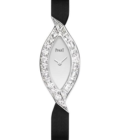 高级珠宝腕表,白金材质项链,镶饰20颗圆形美钻,及12颗长方形,切割钻石,黑色绢质表带,搭载伯爵56P石英机芯