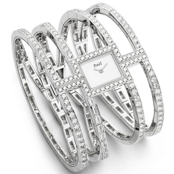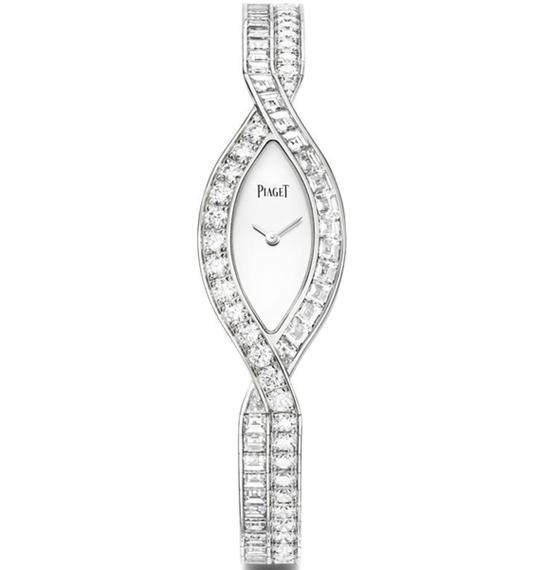 高级珠宝手镯表,白金材质项链,镶饰314颗圆形美钻,及85颗长方形切割钻石,搭载伯爵56P石英机芯