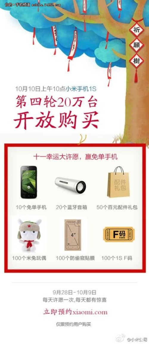 按照小米官方发布的公告显示小米手机1S第四轮二十万台开放购买将于十月十日上午十点开始。但与第三轮开放购买的规则一样,此次小米开放购买的小米手机1S的十五万台标准版以及5万台电信版,仅限本轮及第三轮预约用户参与抢购(上轮开放购买预约用户免预约)。