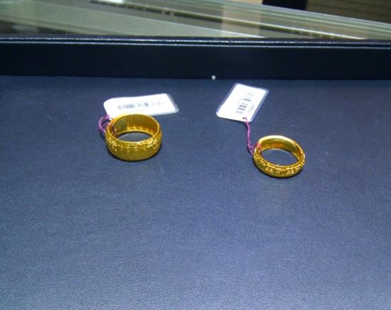 买完手机,问了一下多金铺的地方,原来就在后面,有一条街,还蛮多金铺的。先去了周大福,金价是港币475/克左右吧,款式较少,没找到喜欢的,出来又去了周生生,周生生的服务果然专业,一个带有小酒窝的美女很快就帮我们找到了想要的款式,不过一问手工费,七折,而且怎么不肯少。我说我有会员卡号呢(嘻嘻,悄悄的说,是妈网上抄的),小酒窝美女说,那不早说,直接六折。还是太贵嘛,我听说二折的呀。小酒窝美女可不干了,周生生不可能有这个价的哦。我们只能装作起身说再看看,她也不恼,依然是笑容满面的送我们出门,还说欢迎下次光临。再到妈网上传说的零手工的六福,可店面比较小,也完全没有刚才周生生的良好服务态度,到最后,我们决定还是折回周生生买算了,也就那点手工费,省不了几个钱。于是,回去直接找到那个小酒窝,叫她拿回原来的款,成交。除了速度仍是速度,看看我们到手的两个戒指吧。