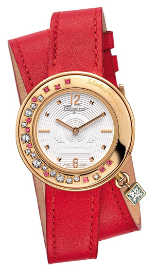 此款腕表采用扭索饰纹表盘,上刻品牌独家的Gancino装饰图案,独具创意、特征鲜明,以现代手法重新演绎出菲拉格慕享誉世界的经典传统:珍贵宝石、精湛工艺、名贵皮革以及大胆的色彩组合。