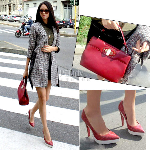 红色手提包:BVLGARI,格纹大衣:FENDI,衬衣:Longchamp,短裤:ToryBurch,红色高跟鞋:Stella McCartney