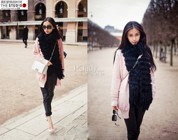 Angelababy:粉色开衫配搭皮裤、尖头高跟鞋,甜美清新又不失摩登气场,皮裤卷边,露出纤细脚踝;大大的绒面围巾增加造型层次的同时,带来浓浓暖意。