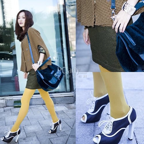 早秋雅致主题@姚笛 的街拍look,缤纷的色彩在秋冬最是讨喜,而浓郁的色调是首选。杏黄色leggings、墨绿短裙,俏丽惹眼又不落浮夸;驼色针织斗篷中和多重色彩,层次分明,甜美摩登。