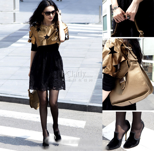 莫小琪:同样是奢华金属风,金属镂空星星短衫配搭蕾丝连身裙、丝绒高跟鞋,高贵又甜美,熠熠生辉。