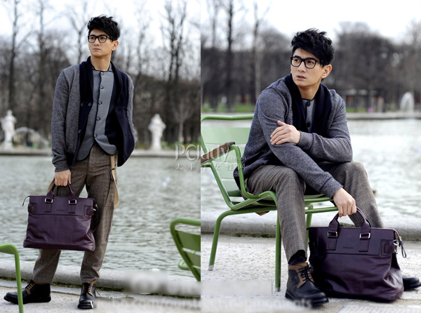 早秋雅致主题@吴奇隆 的街拍look,灰色拼接羊毛开衫、经典的格纹西裤塑造优雅绅士,黑色框镜凸现出淡淡的文艺调调。