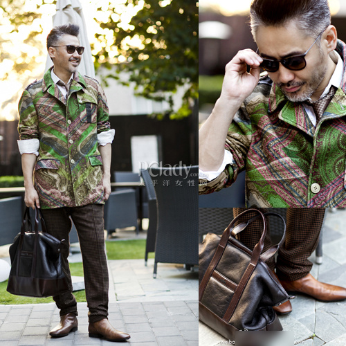 印花主题@吴秀波 的街拍look,摩登艺术家,绚彩印花外套如迷彩般充满活力与探险精神,雅致的千鸟格西裤、棕色皮鞋凸现不俗品味。