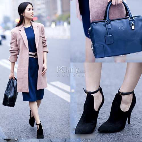 古典与休闲主题@刘诗诗 的街拍look,粉色毛呢大衣简洁优雅,混搭宝蓝色长裙、绒面高跟鞋,甜美不失格调,上班族值得借鉴。