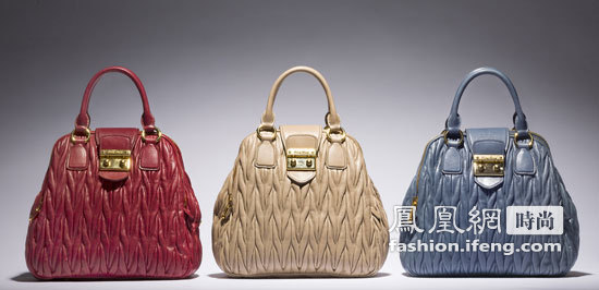 新款Miu Miu Bauletto包袋系列――由Matelassé、Madras和Spazzolato皮革系列组成。此系列延续Miu Miu品牌经典的细节装饰:金属锁扣、金色精钢饰面等,同时拥有全新细节设计如:前袋和对比色缝线等。