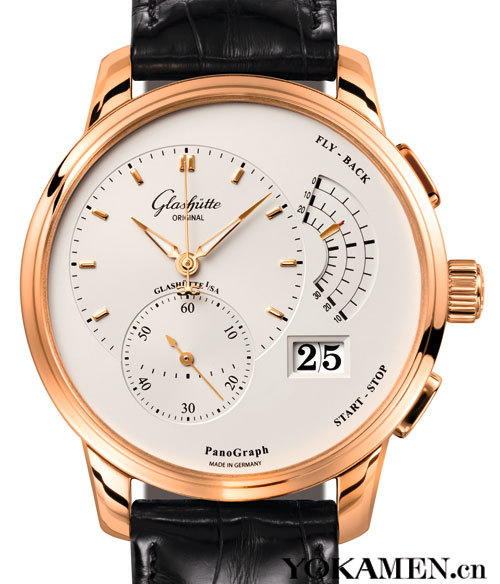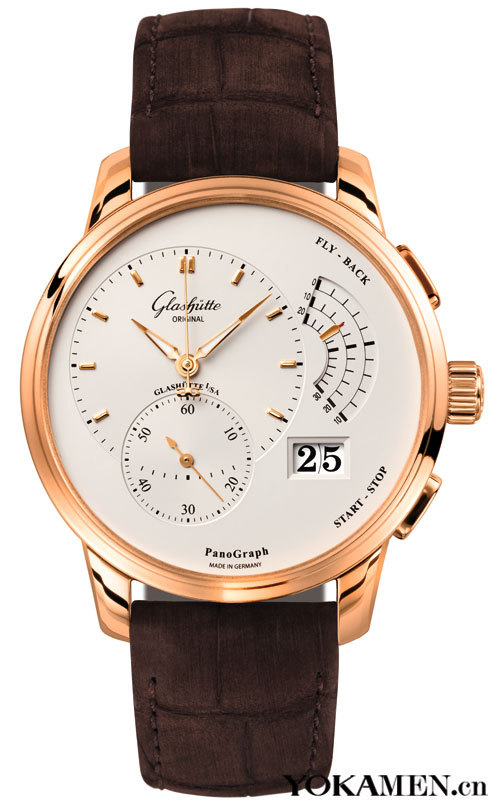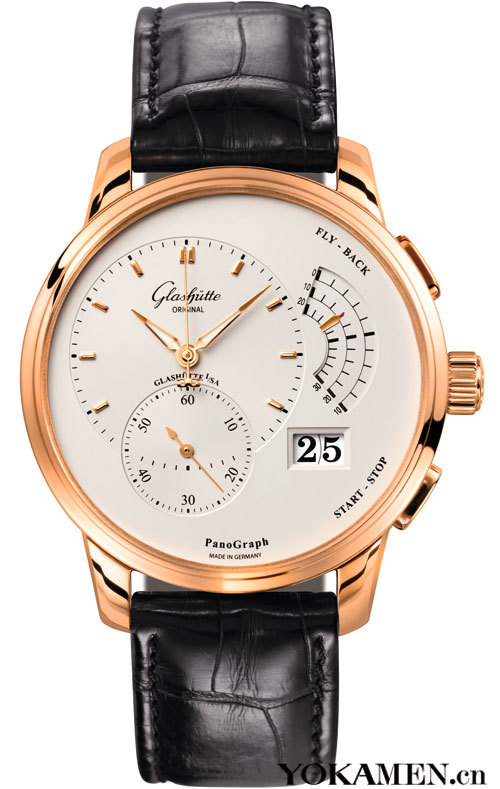 在这款极致腕表的中央是由格拉苏蒂设计的手动上弦机芯61-03。传统转换轮中的手动上弦计时装置控制着多种计时功能,包括开始、停止、归零和飞返功能,无需首先停止即可归零,通过表盘右侧的两个计时按钮即可操控所有这些功能。透过蓝宝石水晶表底,该系列的经典特征和格拉苏蒂机芯的工艺清晰可见,包括饰有格拉苏蒂传统螺纹的四分之三夹板、黄金套筒、平衡螺丝及鹅颈微调。PanoGraph配有比以往款式略宽的黑色路易斯安那鳄鱼皮表带或棕色磨绒鳄鱼皮表带。