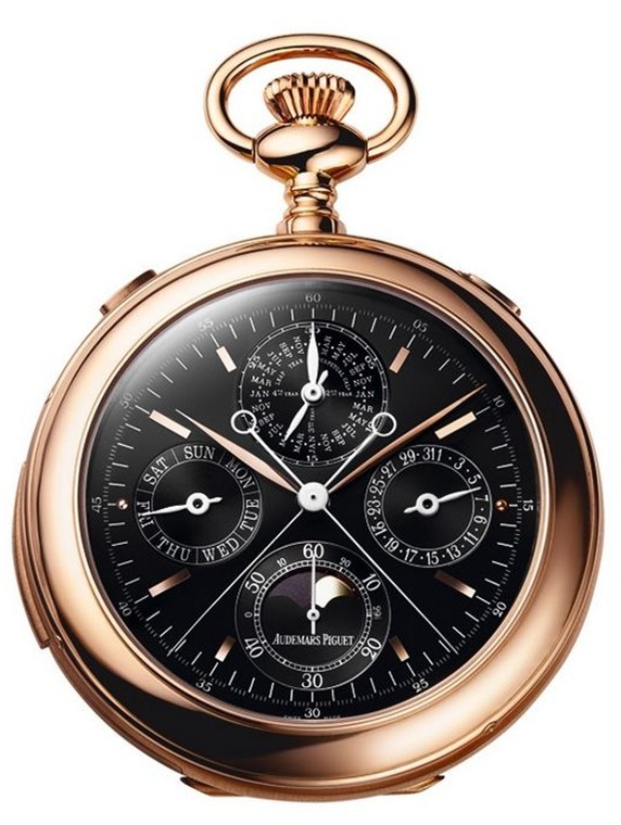 自1882年开始,爱彼每年都至少会制作一枚大复杂功能怀表,以满足收藏家的殷切需求。这枚独立订制的时计,通体由手工打造,需花上数百个小时方能完成,制作一丝不苟,当中更蕴藏了无比复杂的制表知识。此设计模式禀承了工坊130年的制作传统,并成就出一款手动上链机械机芯,打开18K玫瑰金半猎式表壳后,可从表底盖一探内部运作。其结构十分复杂,需花800小时方能完成。在两个多月内,制表工匠日以继夜地组装620个件精细修饰的部件,每次均以手工调校,实为爱彼的标志之作,精致非凡。