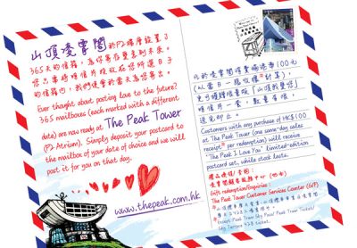 香港太平山顶为您“传爱到未来”:香港太平山顶为游客带来一个“传爱到未来”的新奇玩意! 凌霄阁在山顶为您预备了365天的信箱 (每一个信箱都挂上不同日期),让您随心意选择于未来那一天将明信片寄出,将您的爱语「准时」送到您的挚爱亲朋。 另外,凡于凌霄阁消费满港币100元,更可获赠限量版「山顶我爱您」明信片一套,数量有限,送完即止。